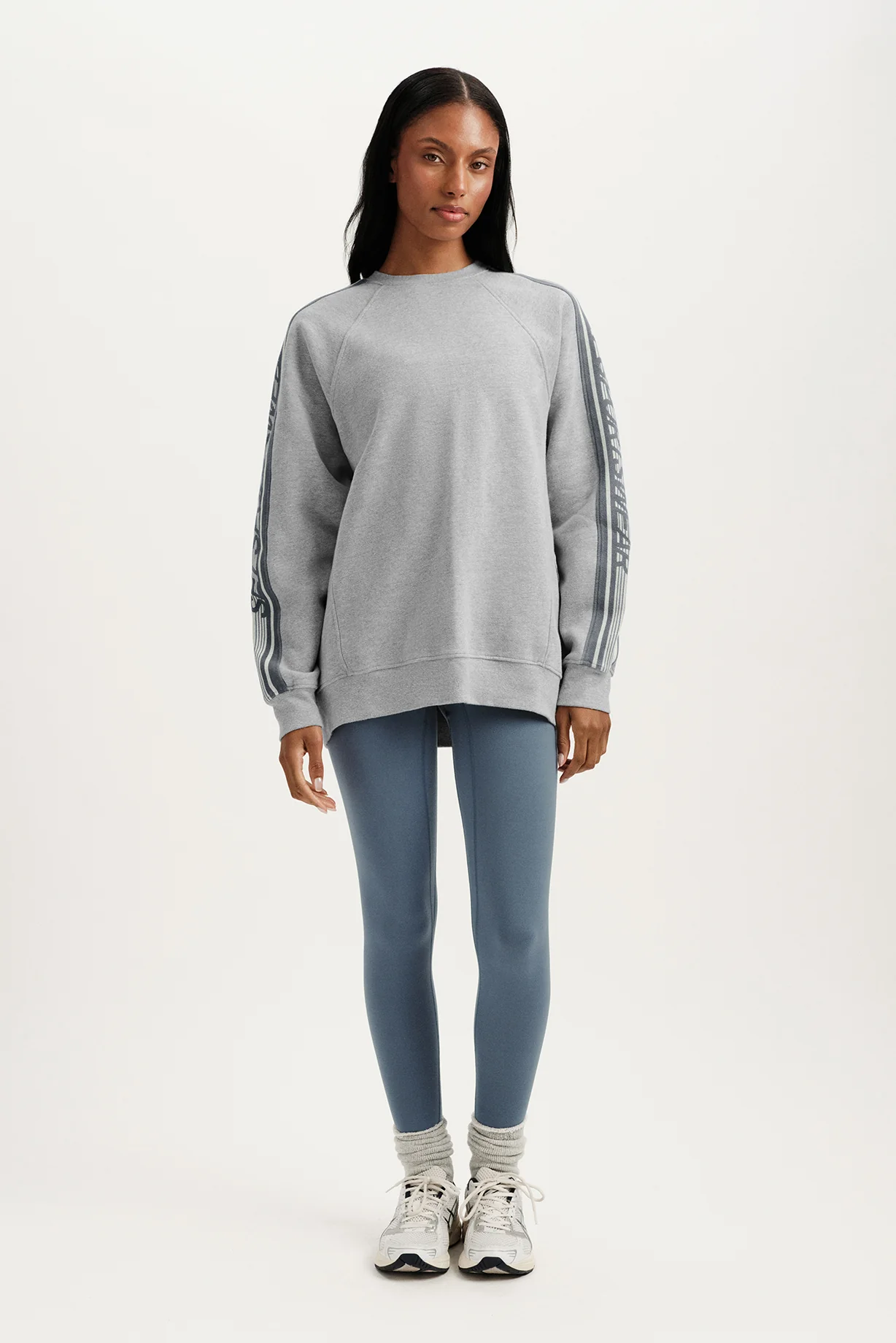Oversized midweight crewneck with rib trims and a bold screenprinted SET SPORTSWEAR sleeve pattern for a vintage, sporty feel.